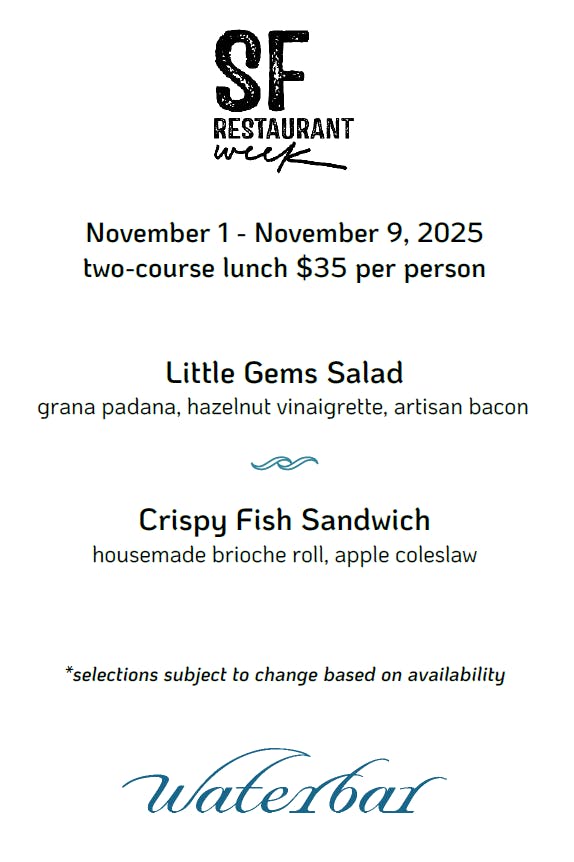 Situated in a prime location on the waterfront of San Francisco’s Embarcadero, Waterbar is one of the Bay Area’s premier dining destinations, serving the city’s best seafood in an unparalleled atmosphere. We offer a daily menu of fresh-caught, sustainably sourced fish and shellfish—as well as the most expansive selection of oysters on the West Coast—set against spectacular panoramic views of the Bay Bridge, Treasure Island, and the San Francisco skyline. Waterfront dining and the finest seafood in San Francisco await you!